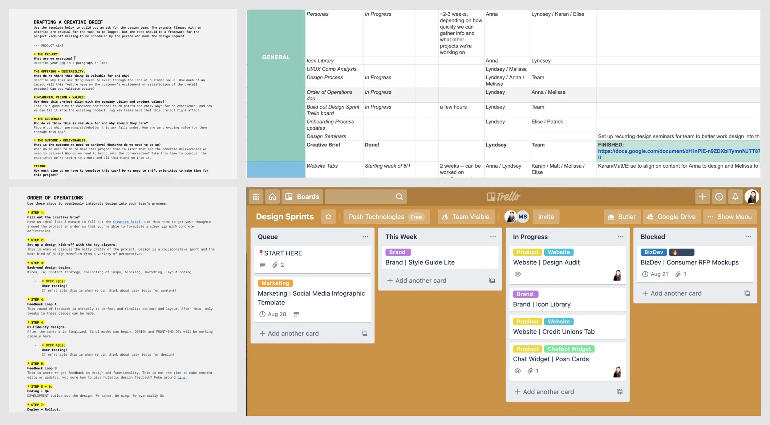 Step 3: Supply Best Practices & Guidelines In my first few months at Posh, I focused on creating communication tools, documentation, briefs, and a Trello-based design ticketing system to avoid adding to the design debt I inherited. By the time I left, I had successfully established a weekly product review and basic brand guidelines for the team, along with a substantial collection of documents including creative briefs, email templates, one-pagers, customer journeys, and detailed customer interview guides.