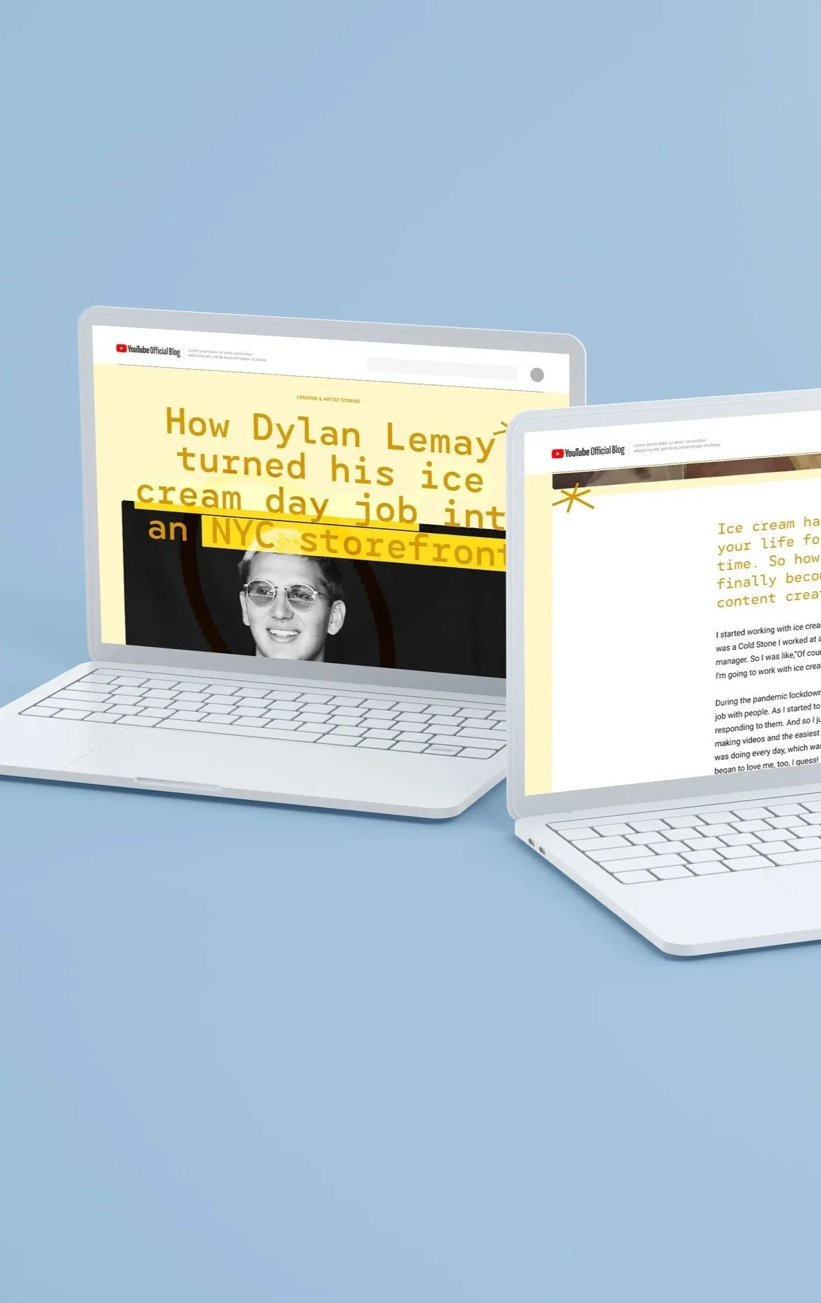 We (myself and a fellow senior designer) were recruited by the YouTube PR Team to update the Official YouTube Blog using the existing CMS (a Google-developed tool called Wagtail) and develop a simplified design system for the team's agency on retainer (Huge) to work from that better reflected the evolving brand ethos of YouTube.